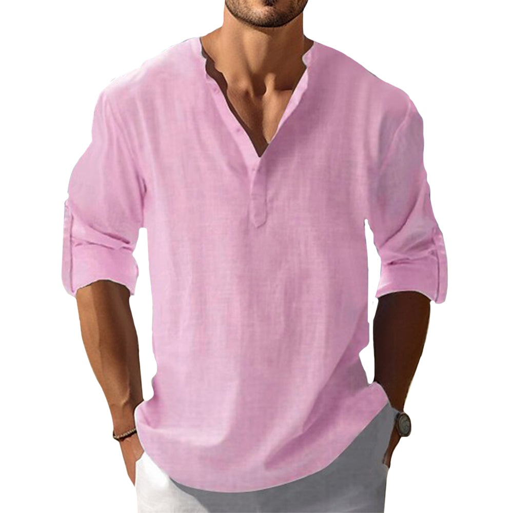 Hand stitched for effortless comfort, this cotton-linen shirt blends a soft, lightweight feel with a naturally airy drape for all-day ease. The relaxed silhouette, smooth texture, and clean V-notch neckline create a refined yet easygoing look perfect for warm days and everyday wear.
