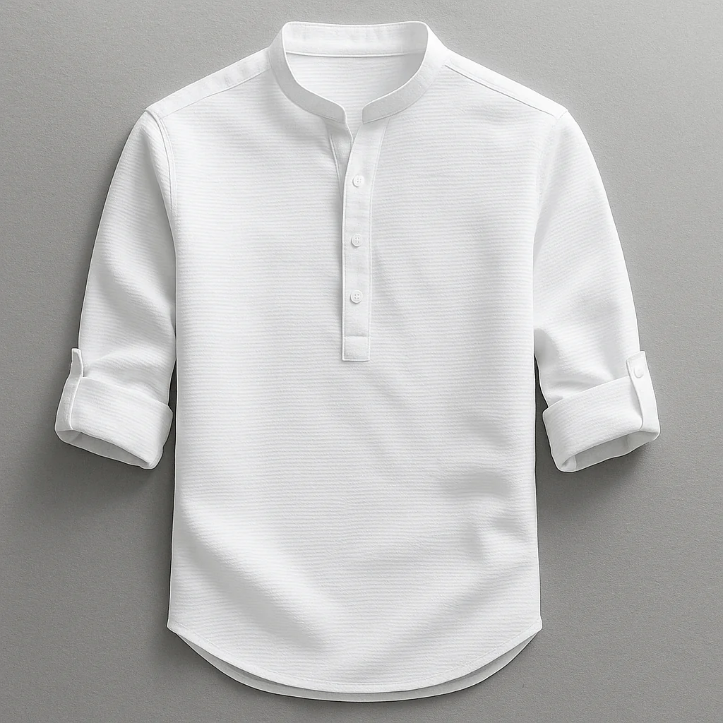 Mandarin collar with a clean buttoned placket